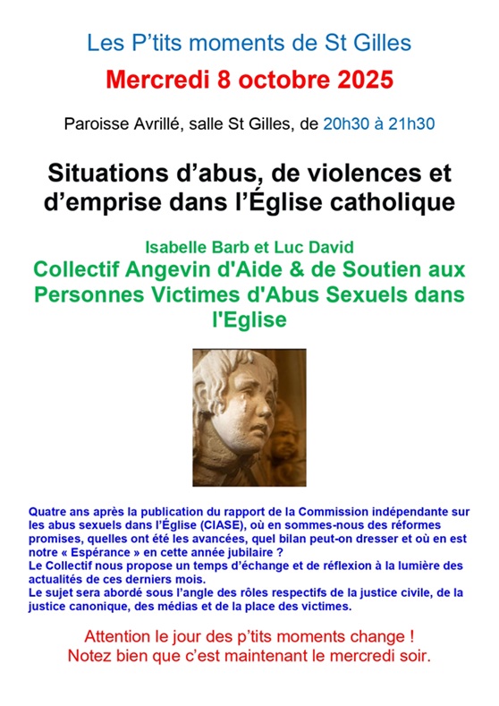 La prochaine rencontre est le 8 octobre.2025. Le thème choisi : Situations d’abus, de violences et d’emprise dans l’Église catholique.